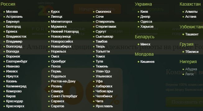 Офисы партнеров Альпари работают в 60 городах РФ, а также в Украине, Беларуси, Казахстане и других странах бывшего СССР. Полный список на скриншоте ниже.