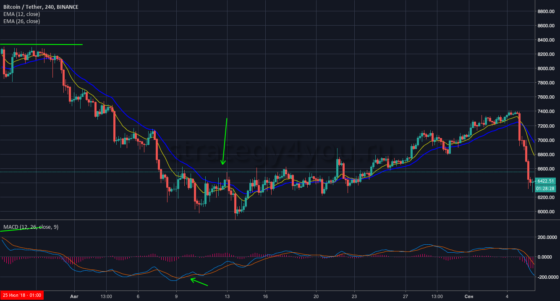 Одна из возможных стратегий торговли с использованием в качестве основного инструмента технического анализа MACD: