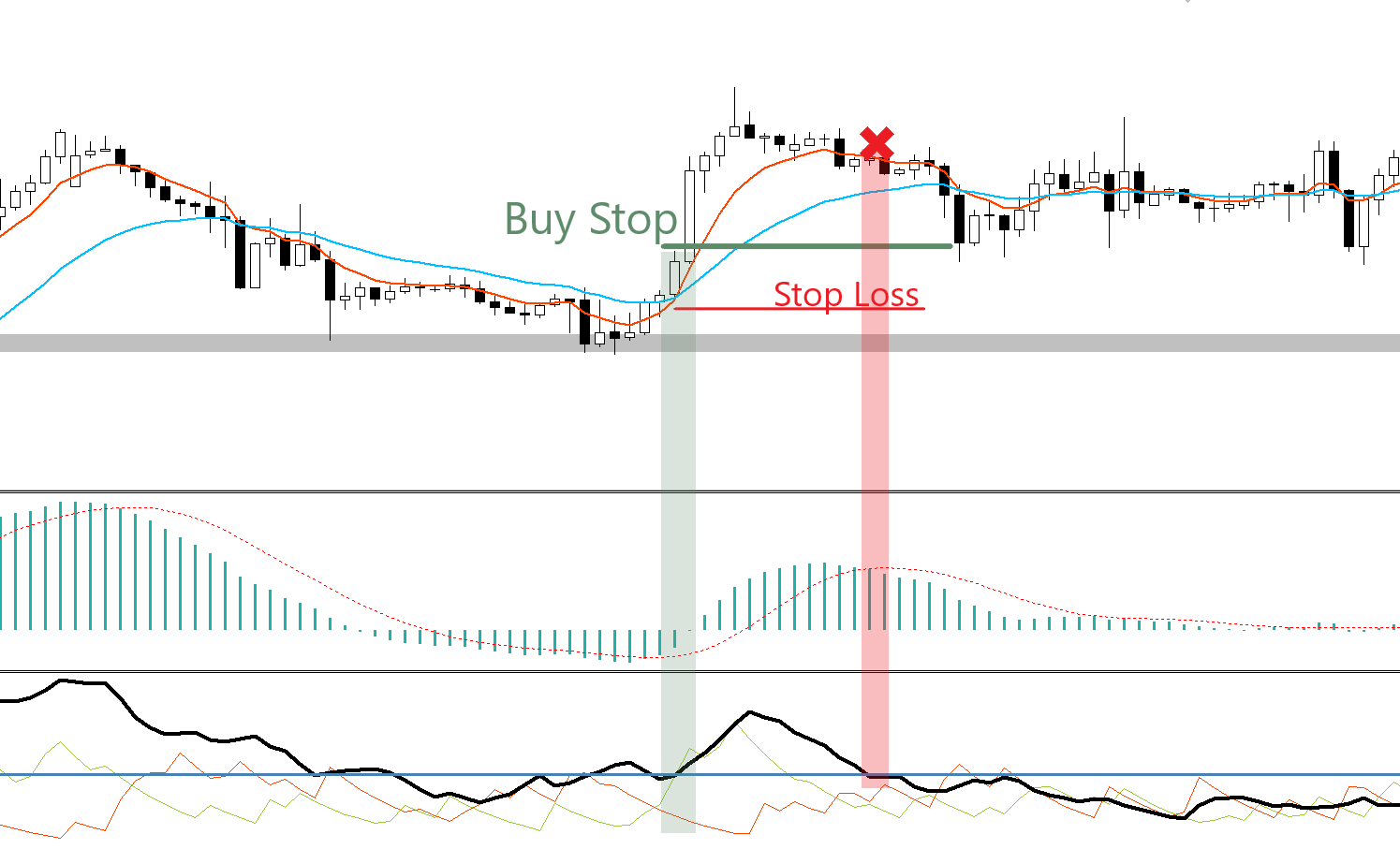 В таком случае мы дожидаемся закрытия свечи, на которой произошло пересечение а ADX и выше его цены High ставим отложенный ордер на покупку Buy Stop.